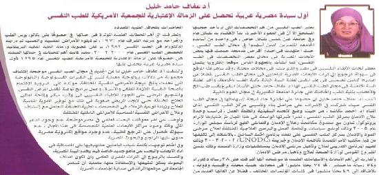 Prof. Afaf Hamed Khalil was the 1st Egyptian Arab Woman to have Honorary fellowship of the American Psychiatric Association.